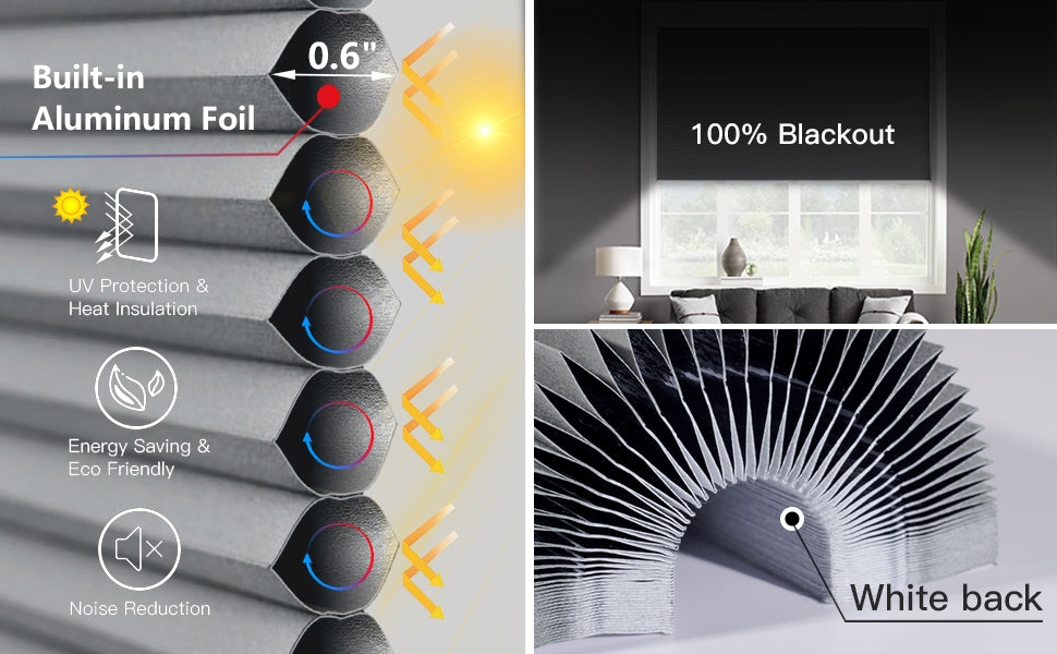 The 100% blackout cellular shade features honeycomb-shaped fabric cells that help keep your space cool in summer and warm in winter.