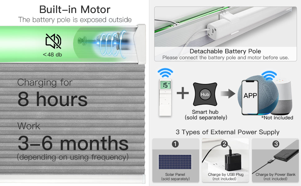 Equipped with a built-in motor and a detachable rechargeable battery pole, which is conveniently exposed for easy access. A full charge lasts for months, and pairing with a solar panel eliminates charging concerns. An RF hub is required to connect with Alexa, Google Assistant, and other smart systems. Choose from two remote control options: