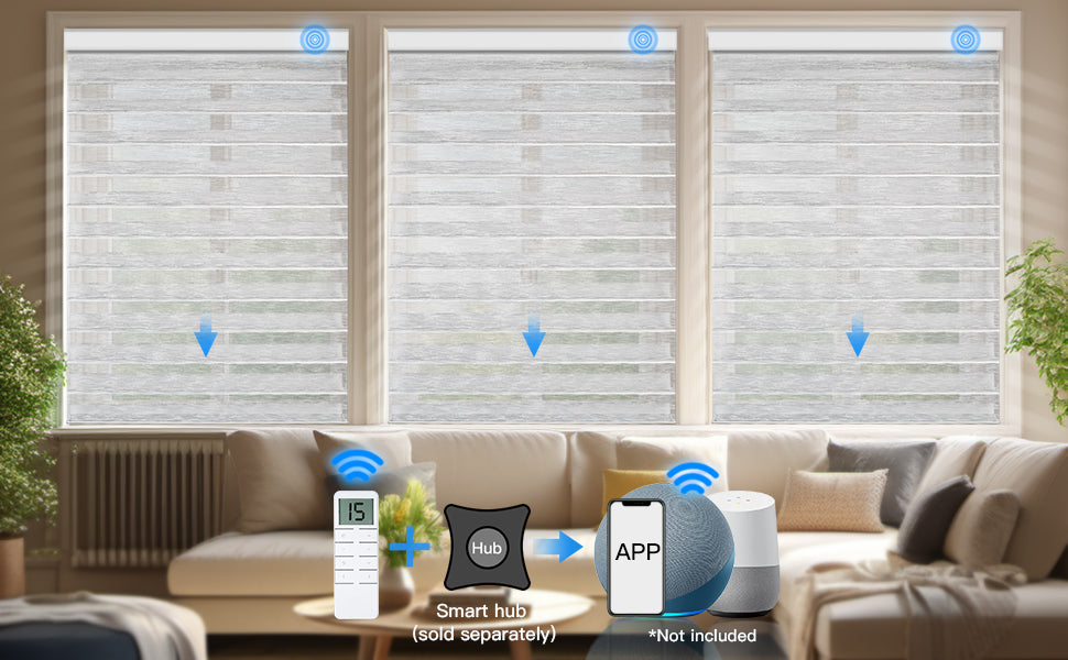 Pre-programmed motor works with the remote right after installation. To connect with Alexa or Google, an RF hub is needed. Add a solar panel if charging is hard —1 panel powers 1 blind.