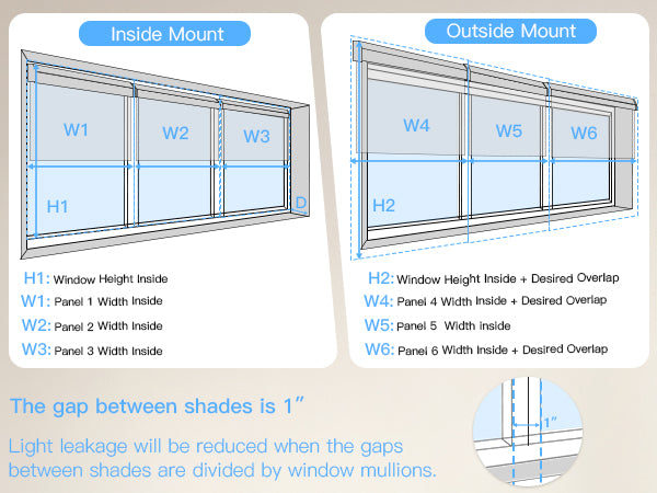 - Outside Mount: Measure full coverage area (width & height). Height includes cassette/valance. To reduce light gaps, add 6" to both width and height.