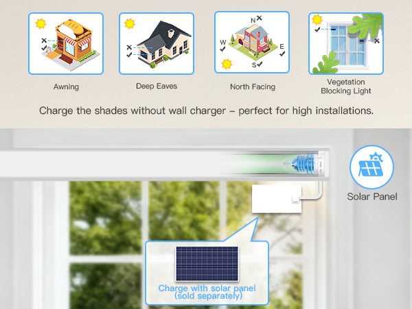 Rechargeable motor lasts months on a full charge. Optional solar panel support eliminates frequent charging needs, ideal for high or hard-to-reach windows. RF hub/bridge required for Alexa, Google Assistant, and other smart home integrations.